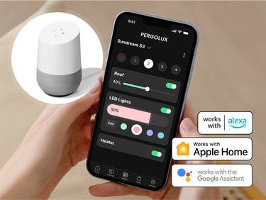 A breakthrough for outdoor living – powered by cutting-edge Smart Matter® technology. Experience seamless automation with intelligent control of your pergola's roof, lighting, and heat lamp for ultimate comfort.